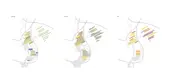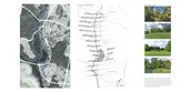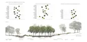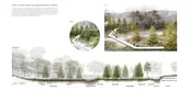 To create an immersive experience that better represents the character of each collection, this project refers to the texture of nature, including water flow, soils, and plants. The patterns extracted from soil erosion and wood grain are manipulated into a symbolic shape. Following the existing topography and elevation, this pattern helps create an internal hydrological system that collects water upstream and retains moisture on the site. Cross-stream strips connect the higher ground with the river’s edge and allow visitors to move between the two as well.