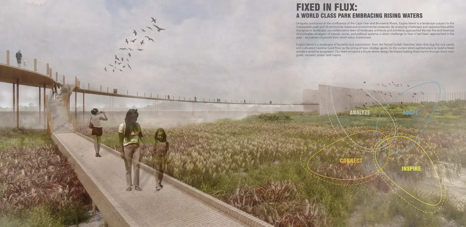 Eagles Island is a landscape of brutality and exploitation: from the forced Gullah Geechee labor that dug the rice canals and cultivated Carolina Gold Rice, to the piling of toxic dredge spoils, to the current short-sighted plans to build a hotel amidst a sensitive ecosystem. But this landscape is also one of possibility. Our team envisions a future where design facilitates healing these harms through three main goals: connect, adapt, and inspire.