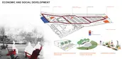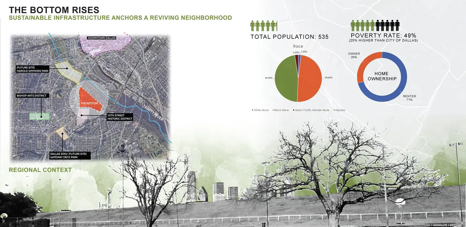 A large section of The Bottom falls into the flood plain due to its unique bowl-shaped elevation, which was created in part through a man-made levee that was built to prevent flooding from the nearby Trinity River. The poverty rate is higher in The Bottom neighborhood as compared to the greater Dallas statistical area, and few opportunities exist nearby for employment. Only a handful of restaurants and convenience stores from which to obtain food are within walking distance. Opportunities exist to connect to networks of public transportation, biking routes, and hiking trails as well as other cultural and recreational opportunities. The master plan responds to these components by aiming to not only utilize a green infrastructure network to minimize the flooding and damage from stormwater runoff in the neighborhood but also take advantage of the green infrastructure as an opportunity to create neighborhood amenities for the residents of The Bottom. Wetland trails, community gardens, and sloped parks are a few of the additions proposed that can both address the issues of stormwater runoff and be used by the community as spaces for economic growth, community events, and recreation.