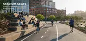 Just past the Grove, the Central Plaza captures the energy of the ballpark, Mission Rock neighborhood, and surrounding communities. It features an all-gender restroom integrated into the topography. To the north, the Shoreline Sands bring visitors closer to the waterfront. Inspired by textures of local beaches, the area features reclaimed eucalyptus logs as interactive seating. Further east, the Stadium Seats encourage groups to gather and watch the action at Oracle Park across McCovey Cove. The seats mirror the terraced form of the seating at the ballpark.