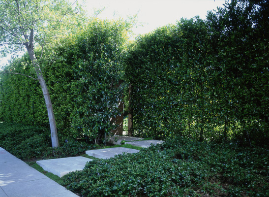 From the project’s inception, the landscape was designed alongside the architecture, since the same firm designed both. Starting with the early schematic drawing and through the final building and planting, the office’s landscape designer worked closely with the architects to ensure a strong connection between interior and exterior spaces. The garden emphasizes and integrates the strong lines, restrained material palette, and bold geometry of the architecture. Additionally the monochromatic plant palette of dark greens compliments with the cool gray of the building. The geometry of horizontal planes is echoed in the rectilinear lawn, planting areas, and swimming pool. These similar forms provide evidence of a shared design vocabulary and evoke a sense of connection.