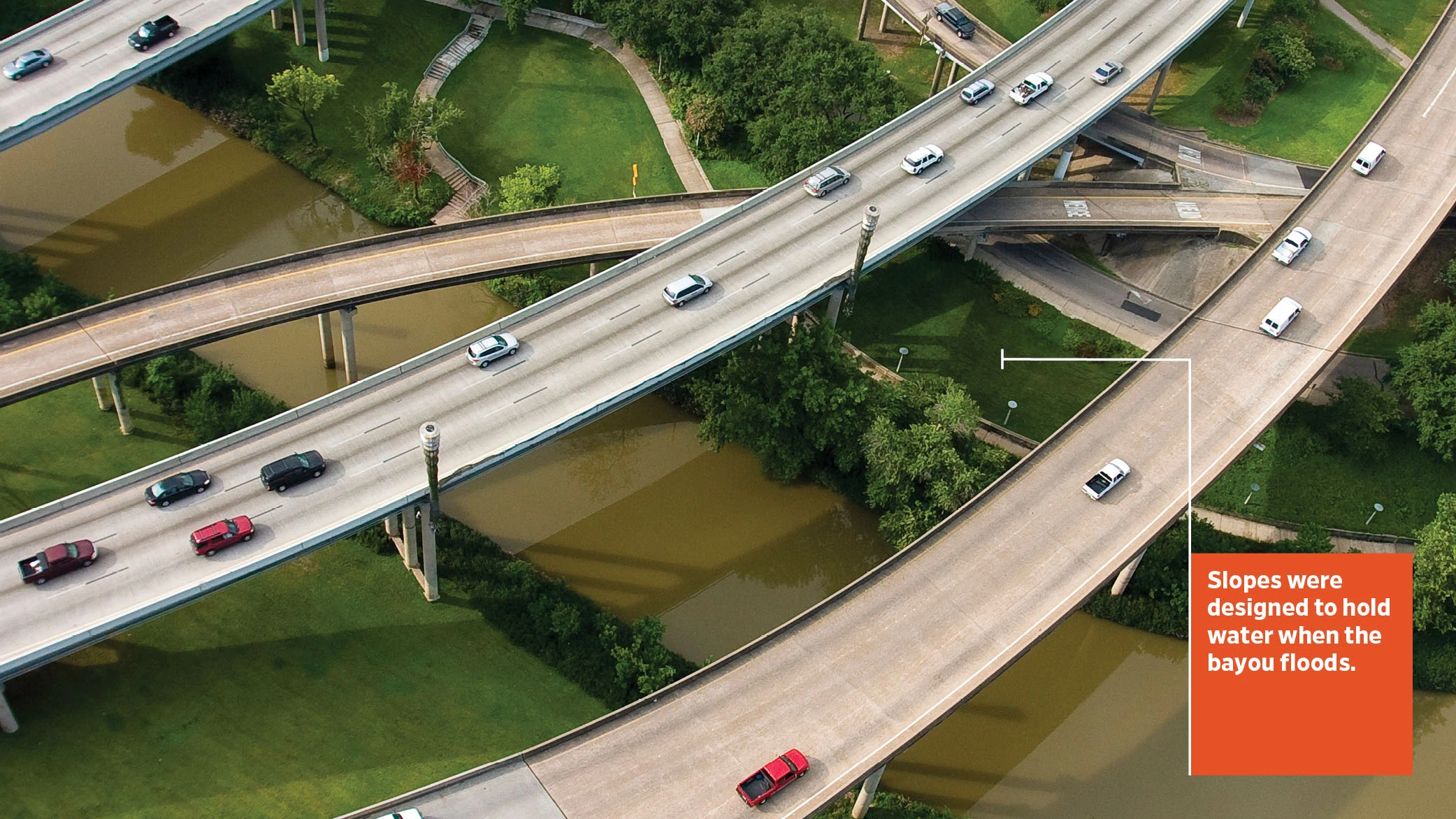 To better manage floodwater, the firm regraded the landscape, laying back the slopes surrounding the bayou to limit the impact of erosion and improve floodwater conveyance.