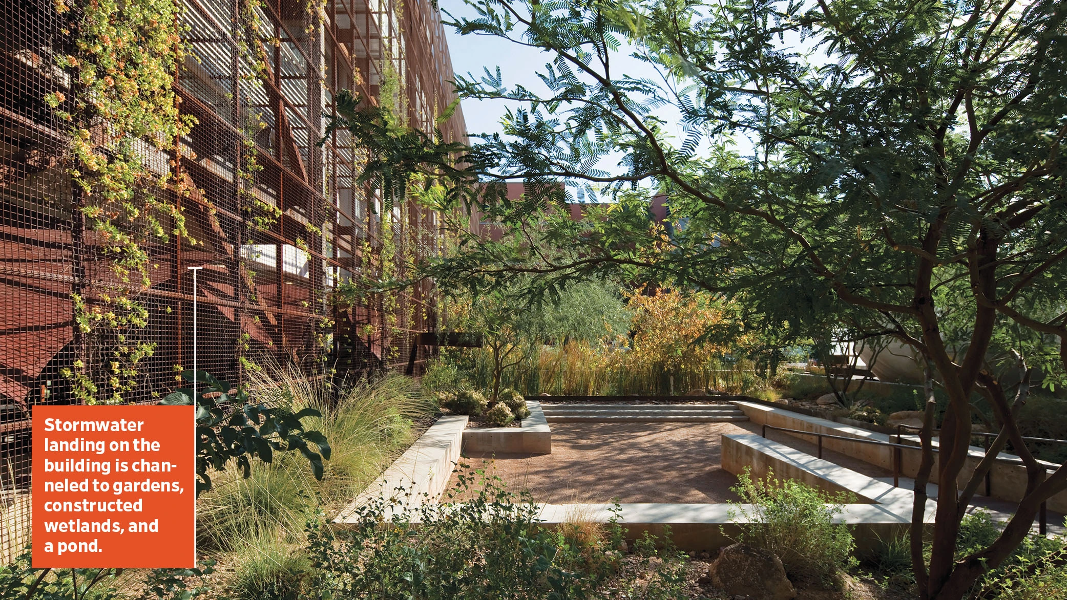 The project increases the biomass of the site by 50 percent even with the addition of a new building in an existing urban setting. As part of the teaching garden “laboratory,” five distinct Arizona biomes, which are ecological communities, are now represented. The resulting urban wildlife habitat has attracted many species of birds, mammals, and reptiles. The pond is home for endangered fish and is listed by the U.S. Fish and Wildlife Service as a Safe Harbor urban site.