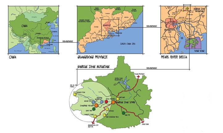 • Crosswaters Ecolodge is located within a 260-square kilometer protected forest called Nankun Mountain Reserve, 80 miles from the city of Guangzhou in southeast China.