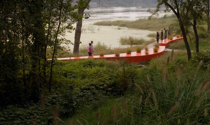 • The park’s “Red Ribbon” steel structure runs 500 meters along the riverbank and is lit from within at night.