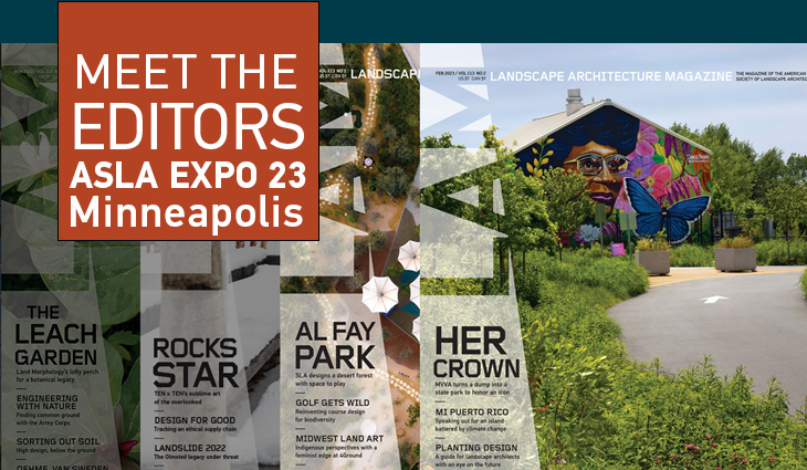 Meet the Editors is an exclusive opportunity for ASLA design professional members to connect with the editors of Landscape Architecture Magazine and Damian Holmes from World Landscape Architecture at the EXPO.