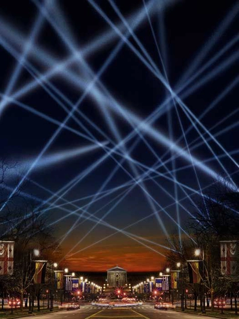 A new piece that just launched promises to upend what cities can do with art at night. Mexican artist Rafael Lozano-Hemmer's Open Air just had its world premier (see image at top). Believing - like Marcel Duchamp - that art requires an audience to make it complete, Lozano-Zimmer has a set of 24 high-powered search lights coursing through the night. The lights are activated by the voice and GPS location of the crowd, who leave message via a Web site. Messages are converted into light arrays every night from 8-11.