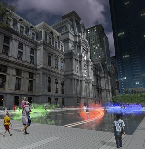 And now, returning to Philadelphia, Echelman has begun work with Weiler at OLIN on Pulse, a new $50 million project that will add a welcome contemporary element to Dilworth Plaza, at Philadelphia's historic City Hall, with its glowing yellow clock. Echelman and OLIN are adding to the "beloved work of historic architecture" by creating a "physical Rothko painting in the landscape." Layers of colored lighting, glowing in water mist that will amazingly leave no water trace on people who walk through it, will illuminate the path of the green, orange, and blue subway lines running under the city, tracing the path of the trains in real time. An exciting hybrid space will appear, with public art, transportation, and landscape combined.