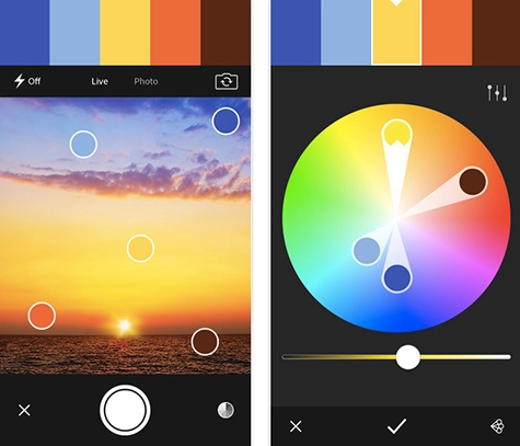 1. Adobe Color CC (free; ios / android): Adobe Color CC allows users to create color themes that can be transferred to Adobe Illustrator, InDesign, and Photoshop. The app allows users to use their screen as a viewfinder and will extract colors from camera views or photos. An interactive color wheel and color slides allow users to adjust individual colors or use pre-set selections based on color theory.