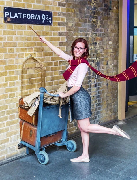 At King's Cross train station in London, Harry Potter super-fans now wait in line for hours to have their photograph taken on the fake platform 9 3/4. "They are there all day and night. What does that mean???"