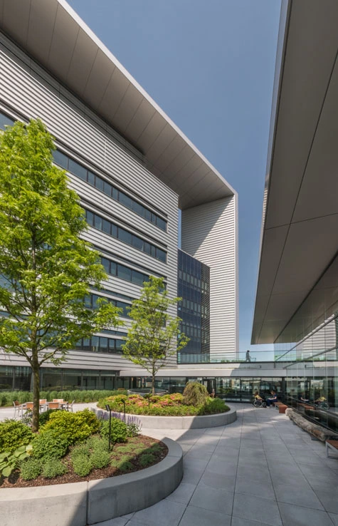 The landscape -- which was ingeniously designed by Copley Wolff Design Group to significantly reduce the impact of flooding in a 500-year storm event -- is both for patients and the public. Like the building, the landscape has small but thoughtful features that exemplify patient-centered design.