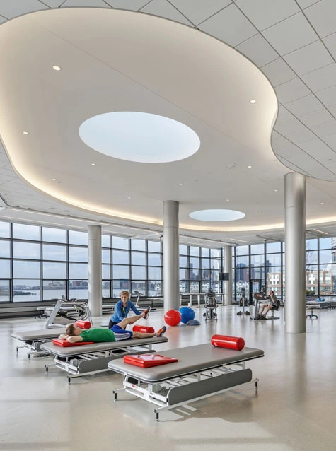 A multi-functional space for physical therapy was designed for "active use." Patients and caregivers didn't just want "a space for respite and solitude. They wanted a space for activity, so they can get mentally and physically ready to re-enter society," explained Sanger.