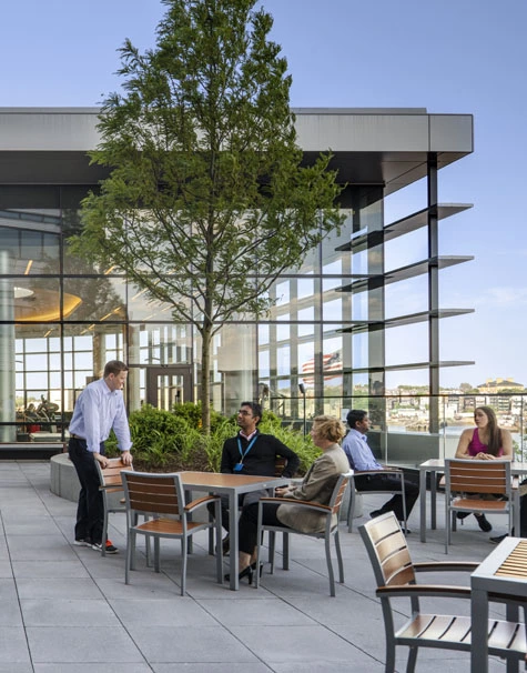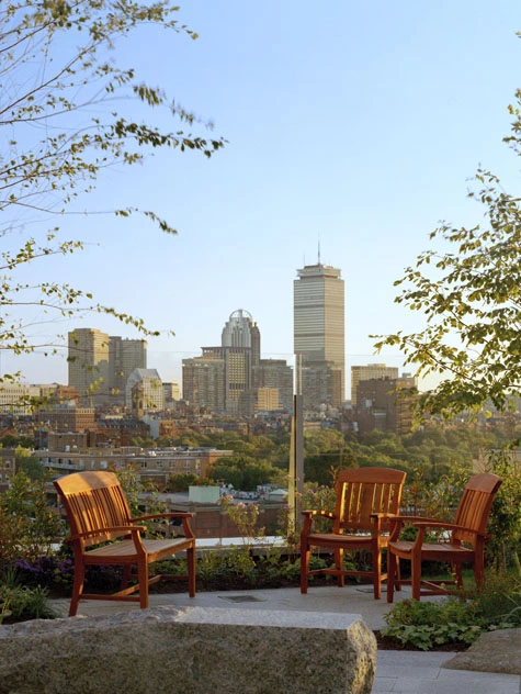 As you enter the roof garden, which was added later after the building had been built, the broad trees and gorgeous views of the Charles River momentarily awe. The space is a welcome surprise in the midst of the vast hospital complex.