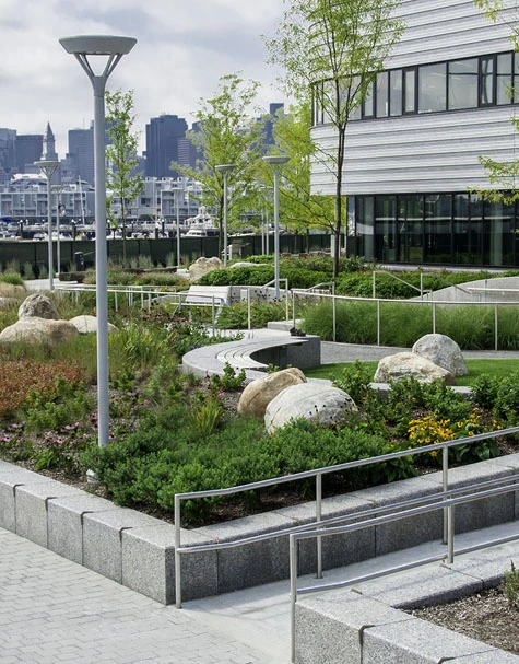 At Spaulding, patients recovering from traumatic injury are rejuvenated by good medical care, but also sunlight, garden terraces, and views of the surrounding Charles, Mystic, and Chelsea Rivers. The hospital landscape is a multi-functional therapeutic space where therapists aid patients in the air and sun. In a tour of the 132-bed facility at the 2017 Greenbuild, Jeffrey Keilman, an architect with Perkins + Will and Sean Sanger, ASLA, principal at landscape architecture firm Copley Wolff Design Group explained how the facility heals, but is also one of the most sustainable and resilient hospitals in the country.