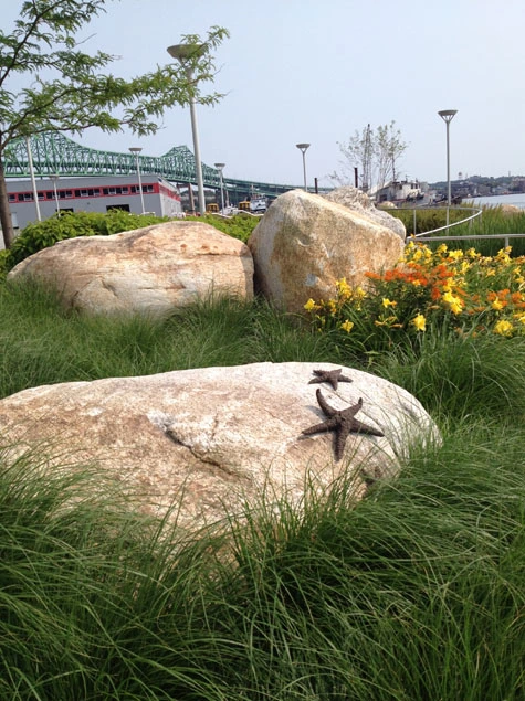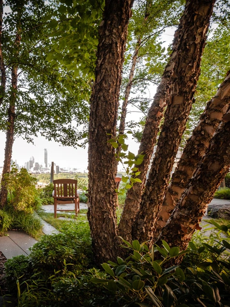 And the garden itself, with its simple shade-covered walking loop, benches facing the river, and sculptures, is open in warm months. "You'll often see patients with their IV in tow walking the loop."