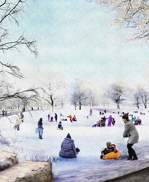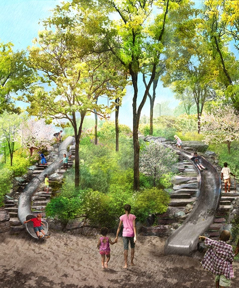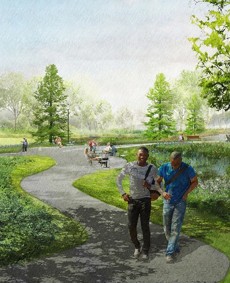 The Obama Foundation and the design team want to create a new woodland walk, sledding hill, playground, athletic center, lawns, and community vegetable garden for school kids to grow and eat fresh produce. The garden helps continue "Mrs. Obama's mission of food and wellness." These new features are set within a landscape designed to sustainably manage water.