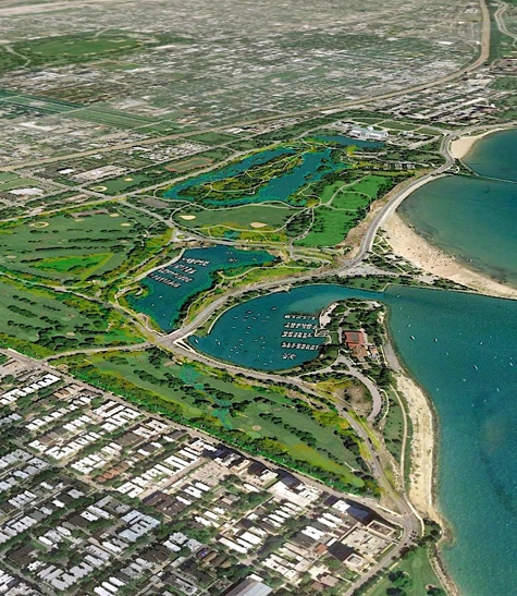 Michael Van Valkenburgh, FASLA, lead landscape architect on the project, told us criticism that the Obama Presidential Center destroys the landscape designed by Frederick Law Olmsted Sr. is incorrect. "There is a complete failure to recognize the history of the 19 acres in question, particularly with respect to Olmsted and Vaux. The Jackson Park -- as designed by Frederick Law Olmsted, Sr. and Calvert Vaux -- was never actually fully realized. Then, the 1893 Chicago Columbian Exposition came in, and Jackson Park was nearly destroyed. The design evolved with guidance from Olmsted Sr., but not Vaux. One of Olmsted's successor firms, headed up by his sons, created a revised plan for the park in 1895, the same year FLO Sr. retired from practice. Olmsted Sr. kept the lagoons intact as did the sons in the 1895 plan. Many of FLO Sr’s big ideas persist in that version of Jackson Park, but given the history, you have to be misguided to argue the landscape between Cornell Drive and Stony Island Avenue is in any way an intact Olmsted Sr. landscape. Or that its current configuration and character is fundamental to our ability to appreciate Olmsted Sr’s. vision for a very large, very watery park."