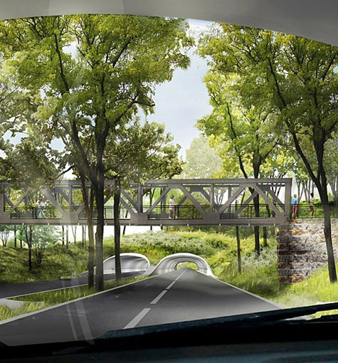 The Gathering Place will offer some 60 miles of trails, connecting the park to the Arkansas River and the rest of the city. MVVA designed land bridges to cover Riverside Drive, a major commuter route, helping to instill the sense of "being in the outdoors." The bridges will "muffle vehicle noise pollution." The problem now, Mayor Bynum said, is "everyone in Tulsa wants a land bridge -- and they cost about $30 million a pop."