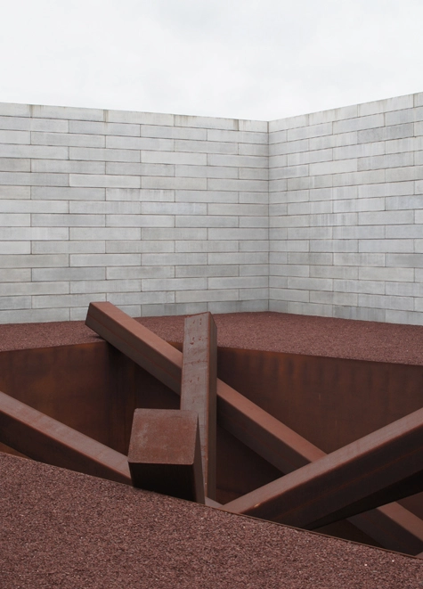 Collapse, one of Heizer's works, called for the special configuration of an entire wing. Only six people are allowed to experience the piece at the same time -- a 16-feet-deep hole partially filled up with rusted steel beams, set in a small ocean of rust-colored gravel, which creates a Martian monochromatic landscape.