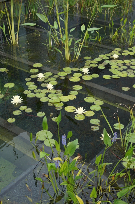 The squares found within the grid enable the landscape architects to create areas of different soil depths, so they can contain and define the different plant life. "Irises need 4 inches of water or less; pickerelweed needs 8-10 inches; but water lilies need 8 feet of water." Each get their own squares.