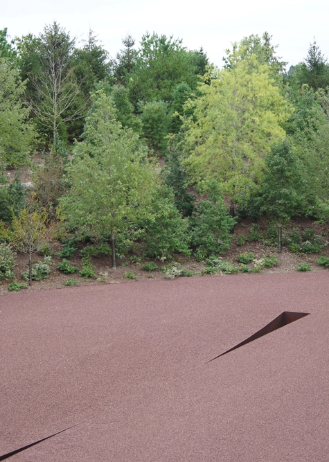 Beyond these banisters, you come across an awing site-specific work by Heizer, called Compression Line, opposing ditches set in his rust-metal gravel.