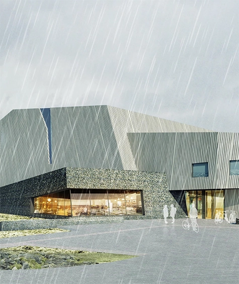 A2F created a power plant with a warm, inviting restaurant and visitor center -- its entire form mimics the glacier and mountain ranges in the background.