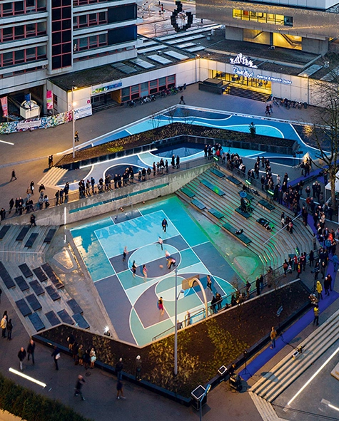 In the past few years, the Dutch have invented new ways to "accept water," including the water square by landscape architecture firm De Urbanisten, which is usually a public plaza with basketball court, but in extreme rain events becomes a temporary water storage space that "holds the water while the sewage system is over-taxed and then lets the water go later."