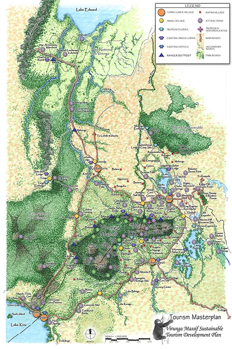 A heart-warming part of the master plan just got realized five months ago on the Uganda side of the Virunga Massif in Mgahinga National Park. The Batwa, indigenous peoples, who used to live in the forest but had been chased out when the National Park was created in 1991, have now been re-located to a new village at the edge of the park and act as guides, taking visitors into the forest in the National Park, and showing them about their lives and connections with the forest. An eco-lodge where I had provided site planning consultancy, funded the Batwa village and Visitor Center, so the Batwa community could share their culture and live closer to the forest instead of the nearby urban town of Kisoro.