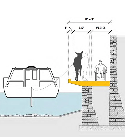 An important discussion in this review focused on whether to expand the width of the narrow towpaths that limit access along parts of the canal. But instead of long, cantilevering pathways that were offered last November, Field Operations now proposes widening the paths slightly and only at key "pinch points," a more strategic solution. Astheimer imagined new linear platforms as contemporary equivalents of the wooden decks that once lined the canal.