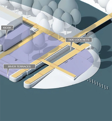 At mile-marker zero, the beginning of the 182-mile-long trail, Field Operations proposes intelligent fixes to improve pedestrian and bicycle connectivity and make the marker more of a destination. One option includes fun "habitable nets," where people can lounge over the water, a feature now seen in other urban waterfront parks.