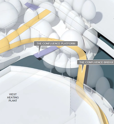 At the old aqueduct, which is now an interesting, graffiti-covered ruin, Corner's team proposes heavily redeveloping the space -- either as zig-zagging overlook platform or as a structure covered in a trestle, with a kiosk. This is the remaining ambitious piece perhaps most reminiscent of the High Line in New York City, which Corner's firm also designed.