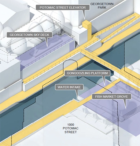 Further west down the canal, at Potomac Street, one of the central commercial hubs of Georgetown, where crowds come hear a jazz trio at Dean & Deluca on the weekends, an overlook has been transformed either into a "sky deck" or terraced seating. The designers propose opening up views across the canal here by clearing old trees along the south side of the canal. Elevators and Americans with Disabilites Act (ADA)-accessible ramps would make the canal, which can only be reached via steep stairs, far easier to traverse. These proposals would likely increase activity here and help bring more people down to the canal and perhaps the Georgetown Waterfront Park a few blocks to the south.