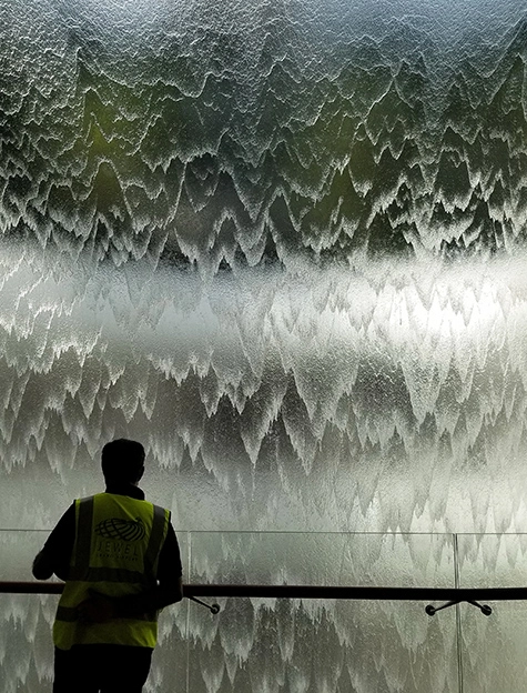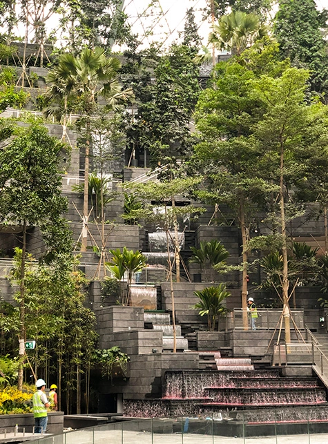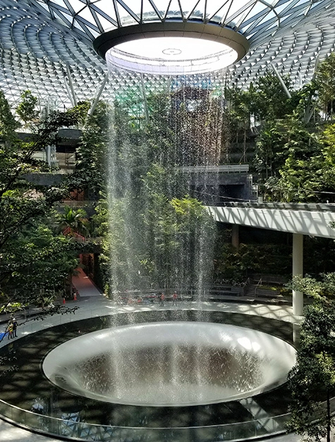 Jewel Changi provides that nearby natural respite with a 5-story-tall forest encased in a 144,000-square-foot steel and glass donut structure. During rain storms, water pours through an oculus in the roof -- creating the 130-foot-tall Rain Vortex, a mesmerizing waterfall sculpture that can accommodate up to 10,000 gallons per minute at peak flow. Stormwater is then recycled throughout the building.