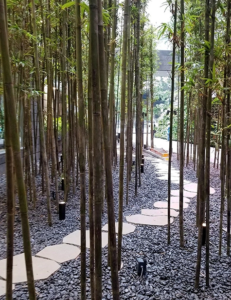 The valley is organized into terraces, like you would find in a shade-covered coffee or tree plantation, and features three types of trees: Terminalia, a native to Madagascar; Agathis Borneensis, which is native to Malaysia and Indonesia; and Agathis Robusta, which is native to Australia. Terraced planters are faced with Indonesian lava stone that epiphytic and and other plants can climb.