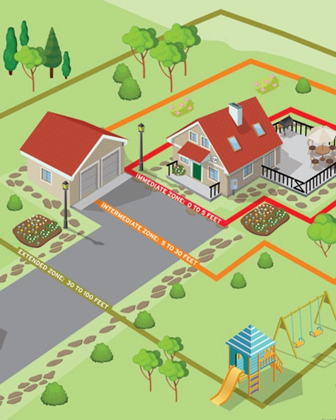 In the immediate zone, there can be no trees and vegetation and all materials need to be fire-proof. In the intermediate zone, lawns need to be trimmed, debris cleared, and trees need to be well-spaced and set within small clusters. In the extended zone, all dead trees and plants need to be removed.