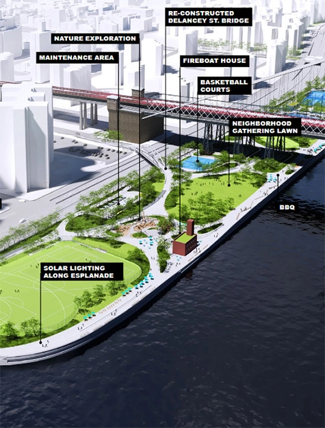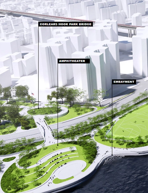 Green infrastructure will be incorporated throughout to manage stormwater coming in from the city and FDR Drive. To accommodate major storm events, the park will also include a cistern with a 40-million gallon capacity. "This is for the super storm that happens once every 50 years."