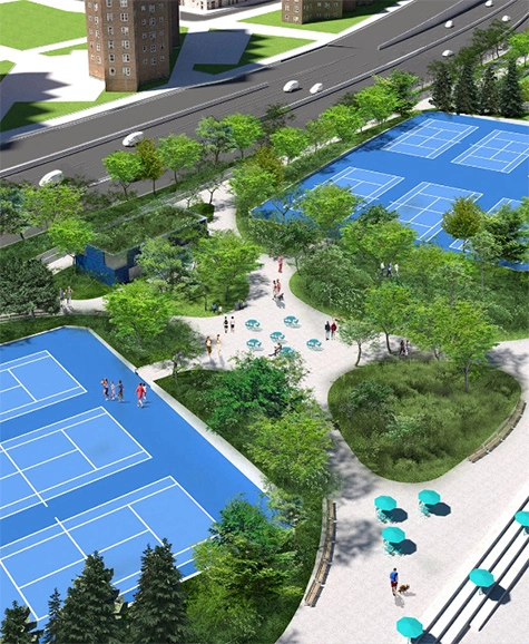 The city and design team kept soccer and football fields, basketball courts, tennis courts, but also added an amphitheater, open lawns, and a playground near the north end. "We created more green space in between the fields, creating parks for non-sports people," said David. Those green spaces will include more than 50 species of trees, much more than the three species there now, including water-friendly black tupelos and cypresses.