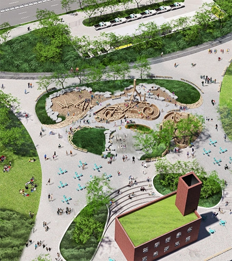 The challenge for the design team has been to integrate the sea wall, retractable inland gates, pedestrian bridges, sports facilities, and social spaces bisected by a highway into one cohesive design.