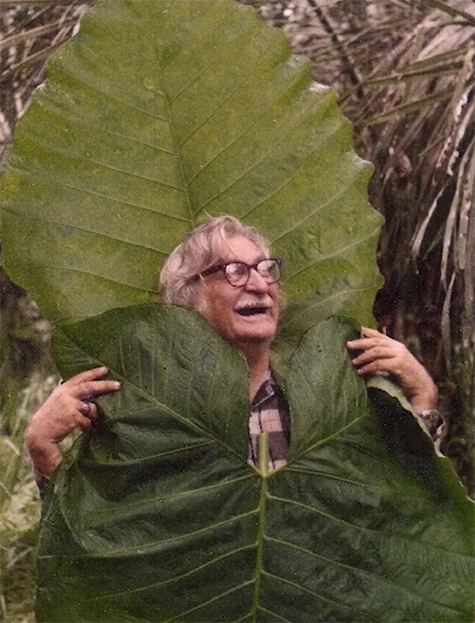 Roberto Burle Marx with his head between two elephant’s ears leaves / NYBG