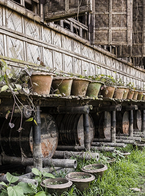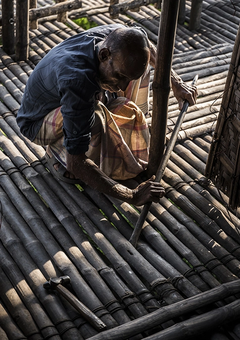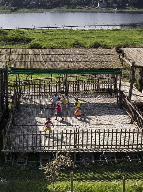 Instead of building a raised structure that would negatively impact the wetland ecosystem, Alam's architect, Saif Ul Haque Sthapati, created a building that can float but also remain tethered during flooding. Upcycled steel barrels raise the school up during high waters, and bamboo planks, the sole building material, were waterproofed by "applying liquid made from boiled local gaab fruit – a traditional Bangladeshi method."