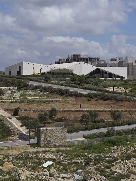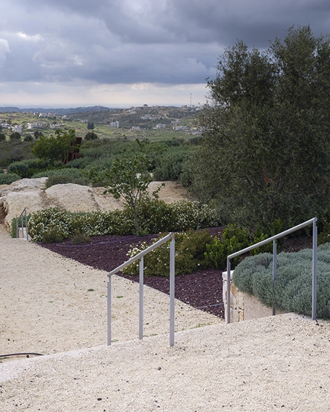 The museum was built on an agricultural site defined by terraces formed with low stone walls (sanasil) and artfully maintained that character. According to the Aga Khan Development Network, "the zigzagging forms of the Museum’s architecture and hillside gardens are inspired by the surrounding agricultural terraces, stressing the link with the land and symbolizing resistance to the West Bank’s military occupation."