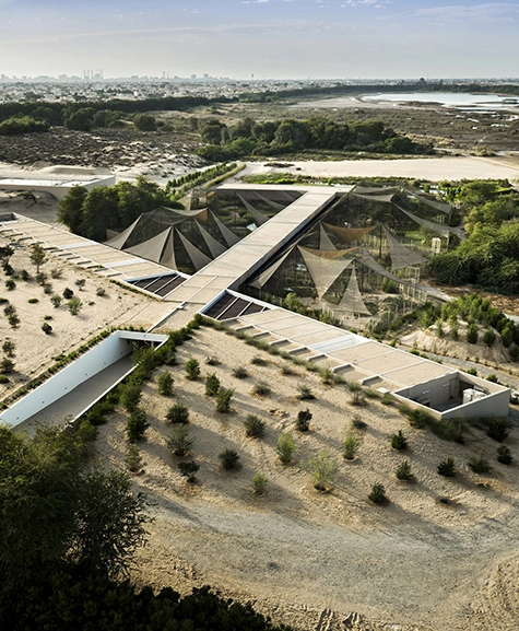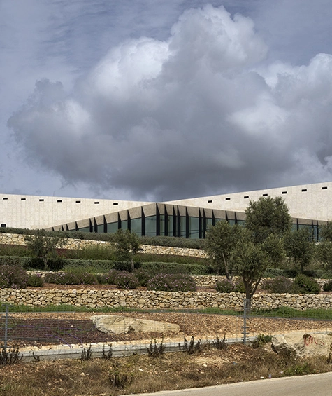 The outer areas of the landscape are used to grow agricultural crops, while next to the LEED Gold, Palestinian limestone-clad building there are gardens that yield produce for the museum's café. Rainwater is harvested from the terraces and amphitheater for irrigation and toilets; greywater is also reused in the landscape.