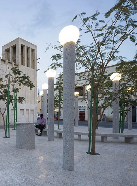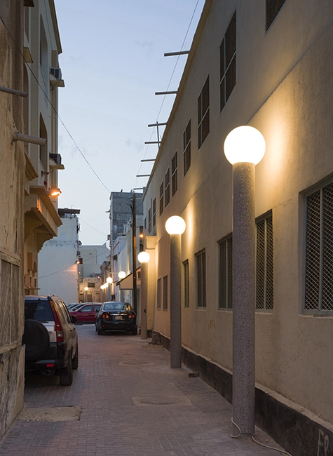 According to the Aga Khan Development Network, "spherical white streetlamps atop terrazzo posts bring further pearl-related symbolism and assist way-finding." Read more about Bahrain's evolving relationship with nature in Paradoxes of Green, a recent book by Gareth Doherty, ASLA.