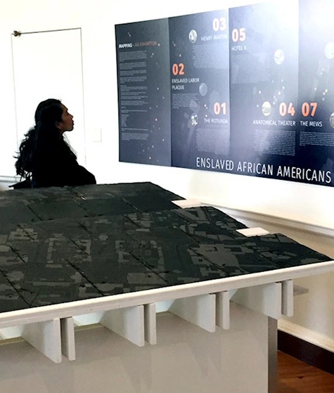 He said the walking tour on enslaved African Americans at the University of Virginia inspired him to work with students to create a new project and exhibition called Mapping, which is now on view in the Rotunda until 2020. The project features documentation from the University of Virginia president’s commission on slavery and an orientation model laser-etched in slate roof tiles that enslaved workers on campus created.