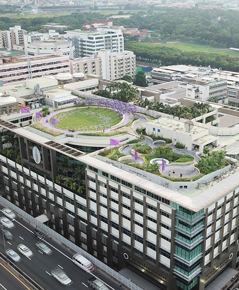 At the Ramathibodi Hospital, we removed a helipad and replaced it with a healing garden. Green roofs are one of the key solutions for how to make a city more porous and sustainable.