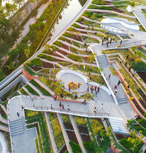 The Thammasat University in Bhutantanang, which is in the greater Bangkok area, will become the biggest urban farming green roof in Asia at 7,000 square meters (75,000 square feet). The roof mimics the structure of rice terraces and how farmers use topography to absorb rain, slow down runoff, and grow food.