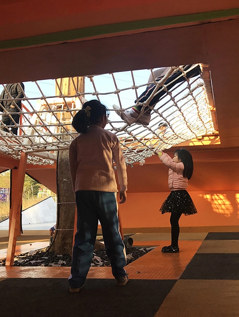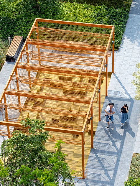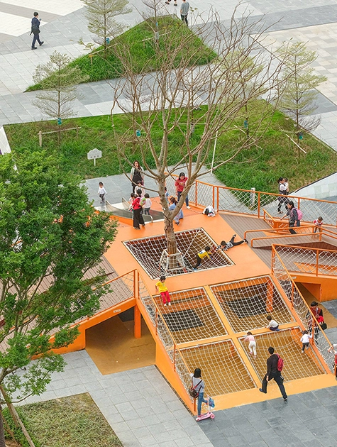 InLandezine, the firm states that there are playgrounds on either side of the square corridor. These include the Family Pocket, a place to swing in hammocks, and the Free Island, which is a "three-dimensional play facility for kids to explore spaces and exercise."