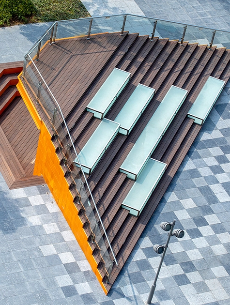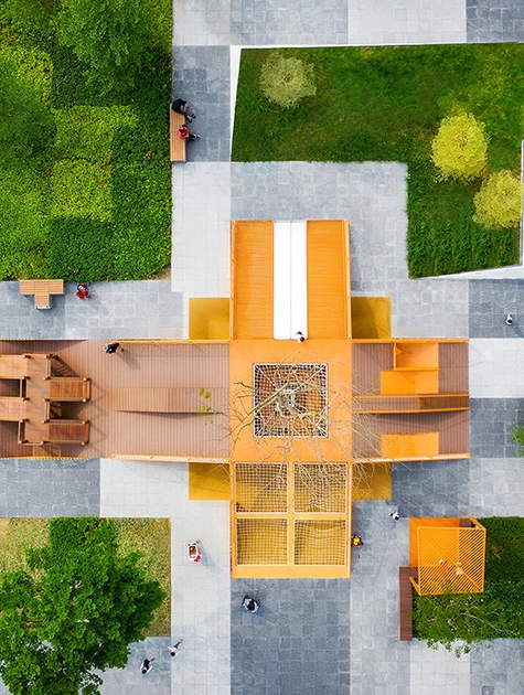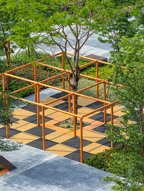 In the northwest corner of the community is the 6,000-square-meter Tetris Square, which shares elements of the design language of that classic game. From the aerial view, pieces of the plaza seem like they could turn and slot into place at any moment.