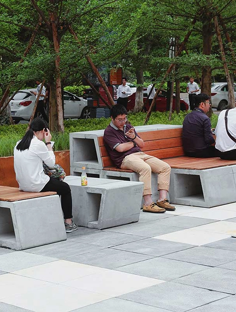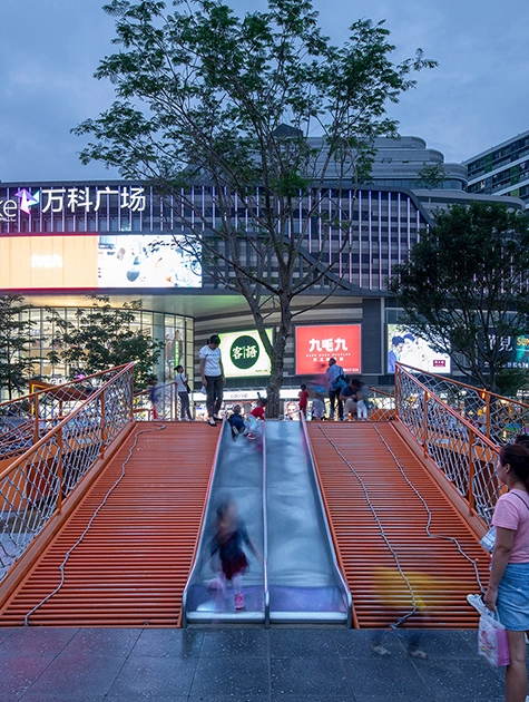 Lab D+H argues that trees are often minimized in Chinese plazas because they are seen as blocking views of shops and restaurants. The firm managed to slip in a grove of trees by integrating it into Family Pocket and Free Island. Trees are also arranged in a "dense-to-sparse" gradient order heading towards the mall.