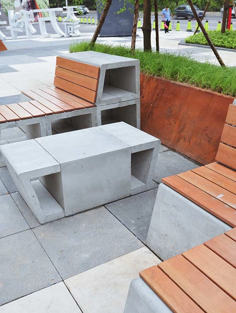 The firm designed a pixelated approach to the landscape design and construction. "From softscape, to paving, to outdoor furniture and installation, landscape elements are arranged on this modular system so that they are easy to construct, assemble, and replace."